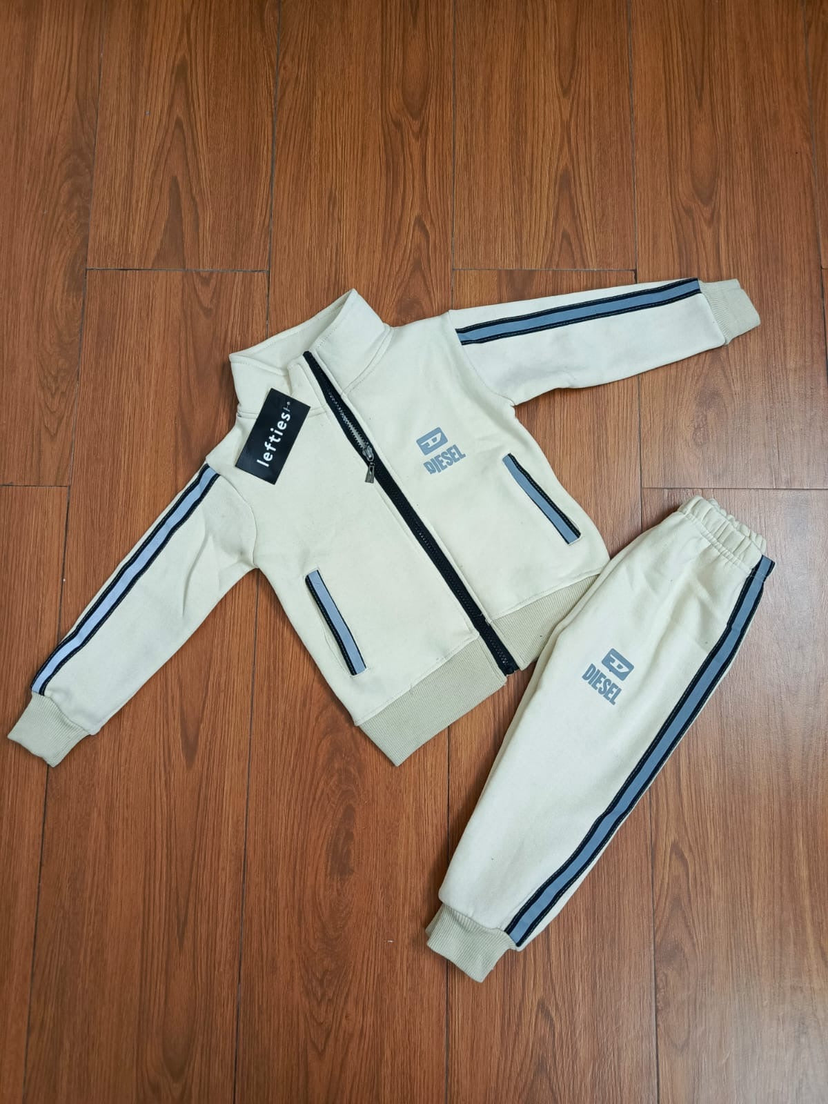 This kids track suit features a cozy fleece zipper, providing warmth and comfort while on the go. Stay stylish and comfortable with this off white track suit, perfect for any active child.