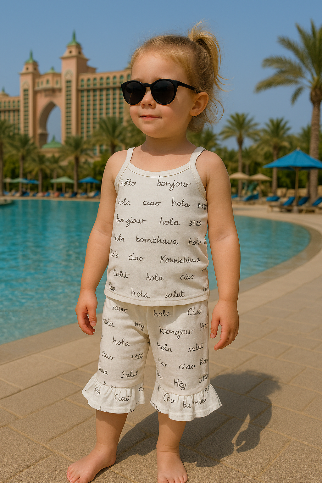 This white bonjour tanktop suit is the perfect addition to your summer wardrobe. Made from soft, lightweight fabric, it's designed to keep you cool and comfortable during the hot months. With its versatile style, you can easily dress it up or down for any occasion. Stay cool and stylish all summer long with this must-have suit.