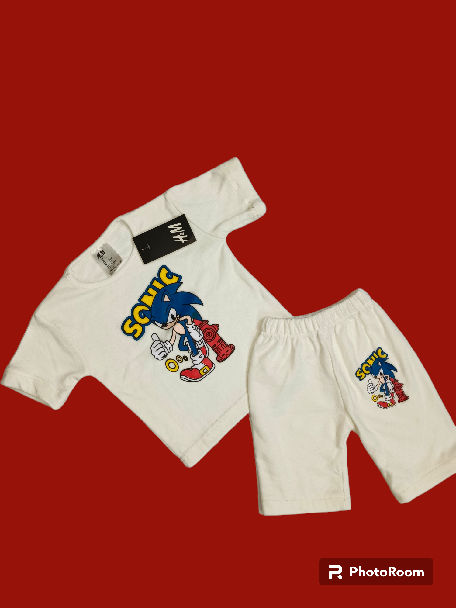 This lightweight White sonic shorts suit is made from soft jersey material, perfect for active kids. Its breathable fabric and flexibility of movement make it optimal for sports and playtime, while its white color adds a classic touch. Experience comfort and style with this expertly designed suit.